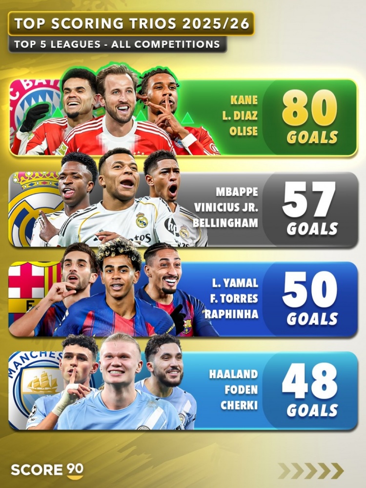 直播吧3月11日訊 本賽季歐洲五大聯(lián)賽的攻擊線,風(fēng)頭最盛的莫過于拜仁凱恩、迪亞斯、奧利塞組成的三叉戟組合。據(jù)score90數(shù)據(jù)統(tǒng)計(jì),拜仁三叉戟截止目前已經(jīng)打進(jìn)80球,距離當(dāng)年在歐洲所向披靡的巴薩MSN組合最高單賽季紀(jì)錄131球,還差51球。