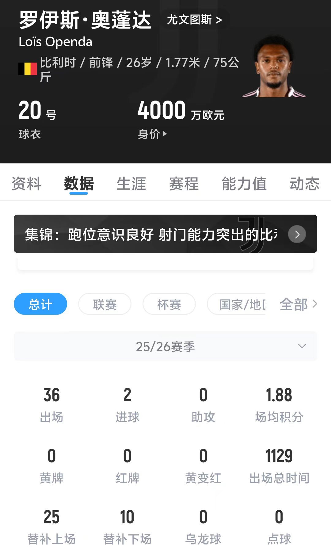 2025年夏窗,奧蓬達(dá)以325萬(wàn)歐元的租借費(fèi),從RB萊比錫租借加盟尤文圖斯。本賽季至今,奧蓬達(dá)代表尤文各賽事出戰(zhàn)33場(chǎng)比賽,總出場(chǎng)時(shí)間1129分鐘,僅打進(jìn)2球沒(méi)有取得助攻。