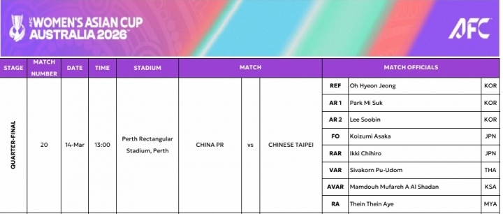 亞足聯(lián)公布本場(chǎng)比賽裁判名單。韓國(guó)裁判員吳賢貞擔(dān)任本場(chǎng)比賽主裁判,助理裁判也來(lái)自韓國(guó),分別為樸美淑、李秀彬。VAR裁判是來(lái)自泰國(guó)的普烏東。