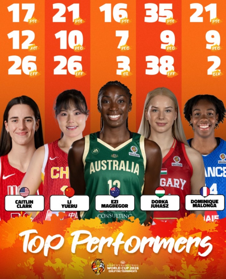 FIBA官方公布了世預(yù)賽首日的最佳陣容,李月汝、美國(guó)女籃的凱特琳·克拉克、法國(guó)女籃的多米尼克·馬隆加等入選。