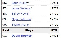 下半場他拿到第35分后,布克的生涯總得分更進一步,超越了湖人名宿“魔術師”埃爾文·約翰遜,排名升至歷史第89位。