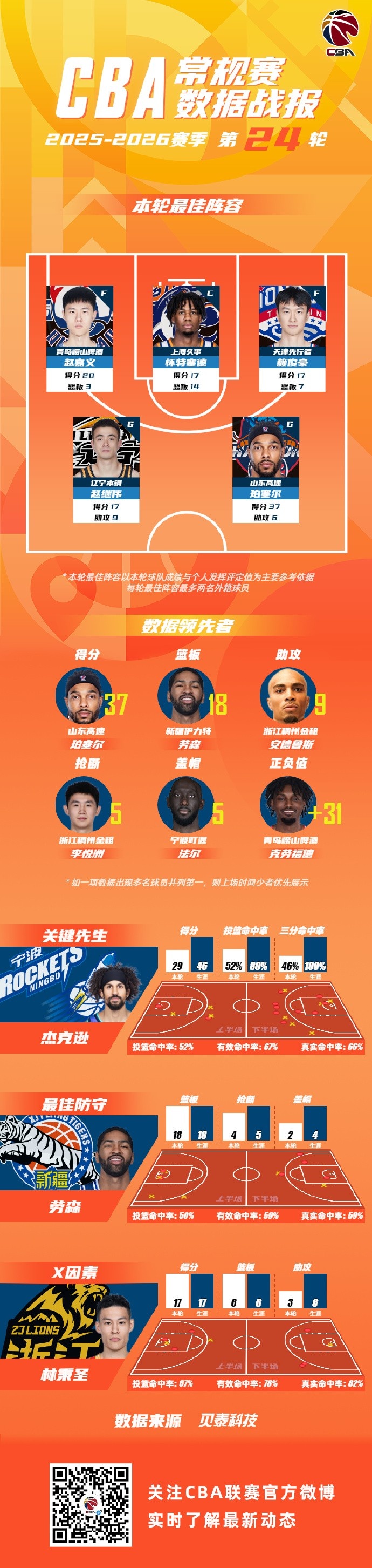 2025-2026賽季CBA聯(lián)賽常規(guī)賽第24輪結(jié)束較量,來自青島國信海天籃球俱樂部的趙嘉義,上海久事大鯊魚的懷特塞德,天津榮鋼籃球俱樂部的賴俊豪,遼寧沈陽三生飛豹籃球俱樂部的趙繼偉和山東高速籃球俱樂部的珀塞爾入選CBA聯(lián)賽常規(guī)賽第24輪最佳陣容!