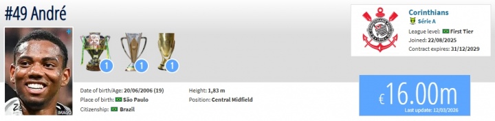 19歲的安德烈場上司職中場,出自科林蒂安青訓(xùn),去年8月被上調(diào)至一線隊,有巴西記者將他稱為下一個卡塞米羅或坎特。本賽季安德烈已經(jīng)成為了科林蒂安的主力,出戰(zhàn)13場比賽打入2球。