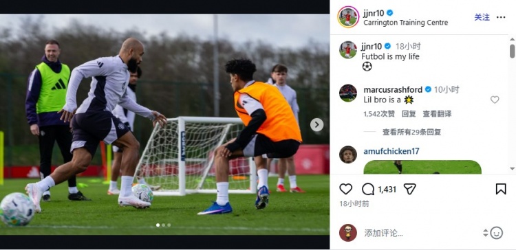 15歲的JJ·加布里埃爾是曼聯(lián)青訓(xùn)最耀眼的新星,昨晚他在Instagram曬出自己跟隨一線隊(duì)訓(xùn)練的照片,并寫道:“足球是我的生命。”