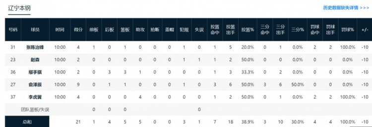 遼寧:俞澤辰9分1籃板,張陳治鋒4分1籃板,李虎翼4分4助攻。