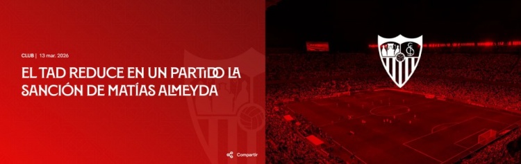 直播吧3月14日訊 塞維官方消息,體育仲裁法庭對(duì)塞維利亞足球俱樂(lè)部提出的上訴進(jìn)行了審理,并決定將球隊(duì)主教練馬蒂亞斯·阿爾梅達(dá)的禁賽場(chǎng)次減少一場(chǎng)。此前,阿爾梅達(dá)在對(duì)陣阿拉維斯的比賽后被罰下場(chǎng)。