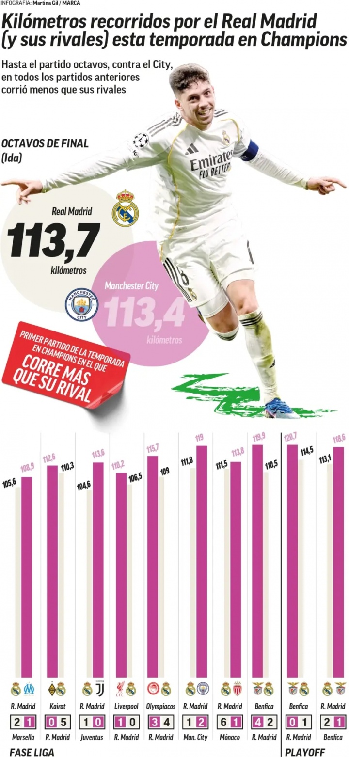 歐冠1/8決賽首回合,皇馬主場(chǎng)3-0完勝曼城。西班牙媒體《馬卡報(bào)》撰文,分析了皇馬在本場(chǎng)比賽中展現(xiàn)出的跑動(dòng)能力。