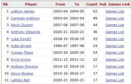 NBA歷史青少年球員砍下20+的場(chǎng)次榜如下: