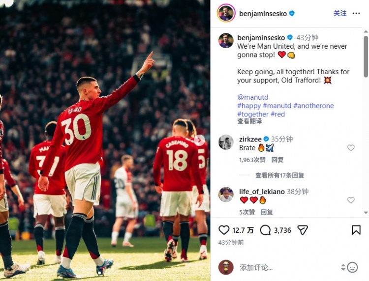 直播吧3月2日訊 本輪英超,曼聯(lián)在主場(chǎng)2-1逆轉(zhuǎn)擊敗水晶宮,攻入制勝球的舍什科賽后在Instagram發(fā)文慶祝。
