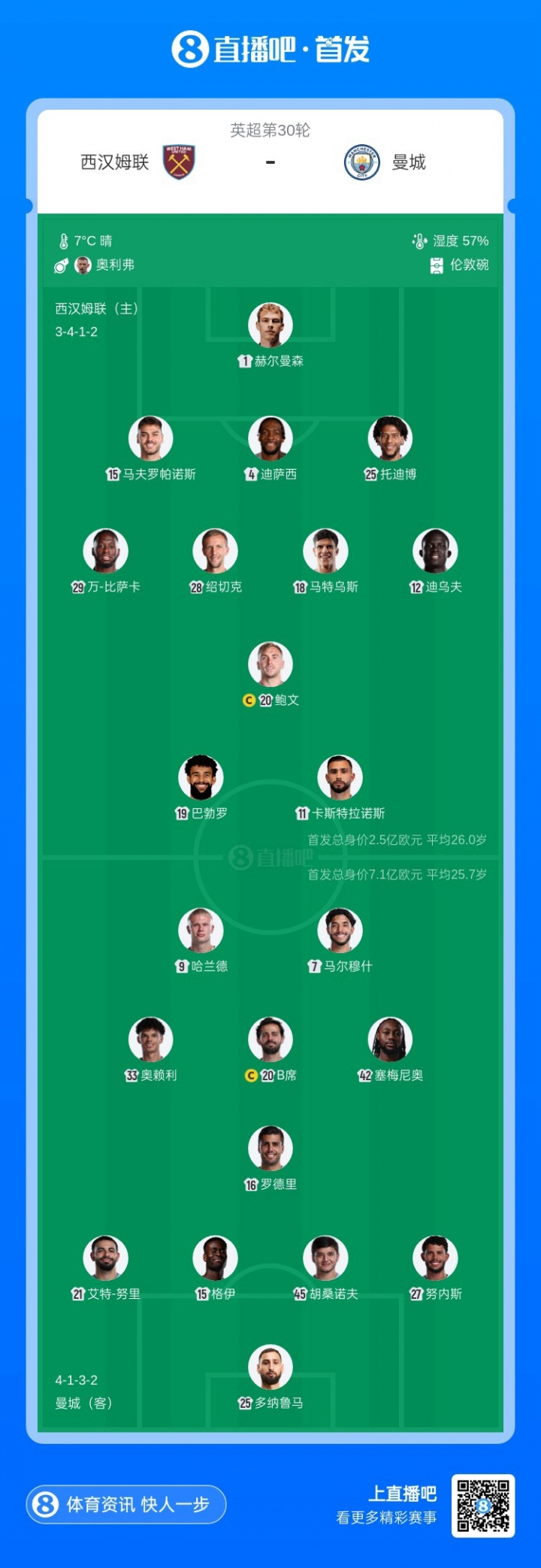 曼城首發(fā):25-多納魯馬、27-努內(nèi)斯、45-胡桑諾夫、15-格伊、21-努里、16-羅德里、20-B席、33-奧賴?yán)?-馬爾穆什、42-塞梅尼奧、9-哈蘭德