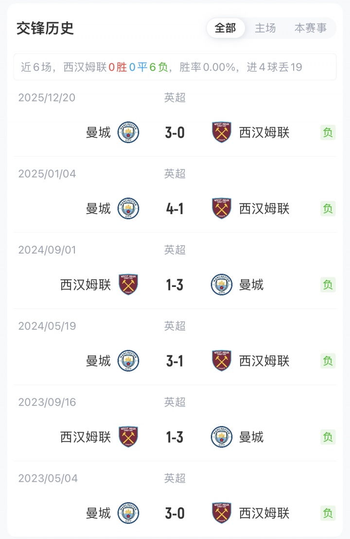 曼城聯(lián)賽18勝6平5負(fù)積60分暫位英超第2,目前已連續(xù)7輪不??;西漢姆聯(lián)聯(lián)賽7勝7平15負(fù)積28分暫居英超第18,近4輪僅1勝。曼城對(duì)陣西漢姆聯(lián)已獲7連勝+連續(xù)24場(chǎng)不?。?平20負(fù))。