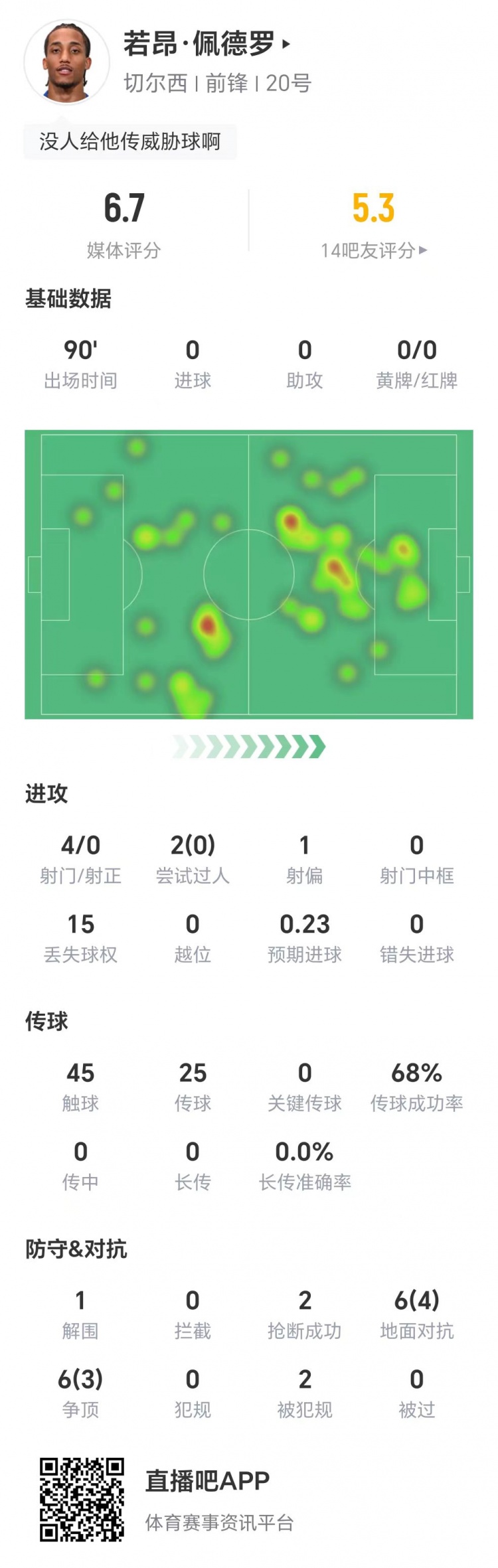 若昂·佩德羅數(shù)據(jù):零射正,零成功過人,零關鍵傳球,獲評6.7分