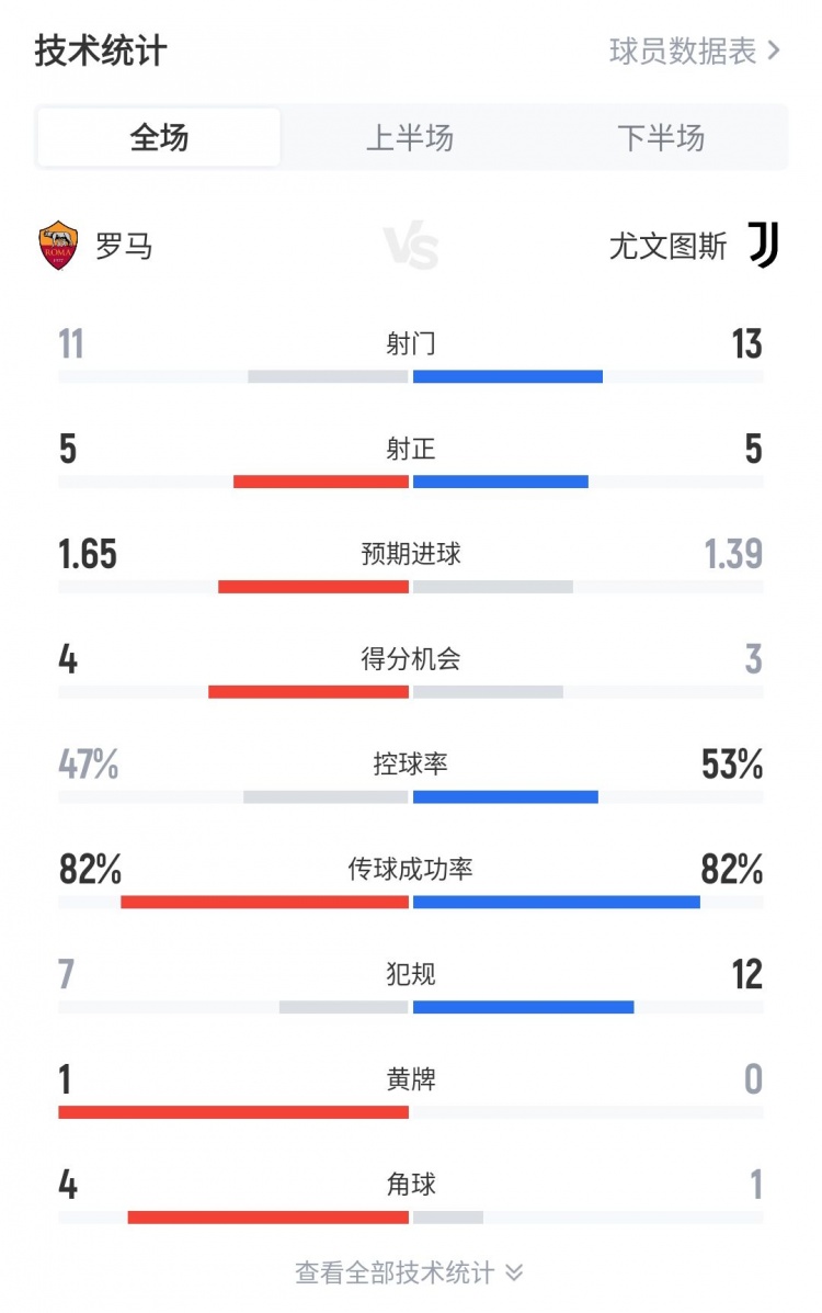 平分秋色!羅馬3-3尤文全場(chǎng)數(shù)據(jù):射門11比13,得分機(jī)會(huì)4比3