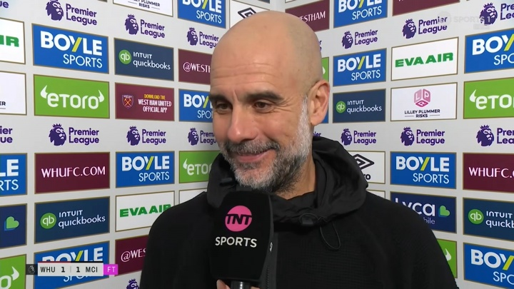 直播吧03月15日訊 本輪英超結(jié)束多場(chǎng)對(duì)陣,阿森納2-0埃弗頓,曼城1-1西漢姆。賽后,瓜迪奧拉接受tnt sports采訪。