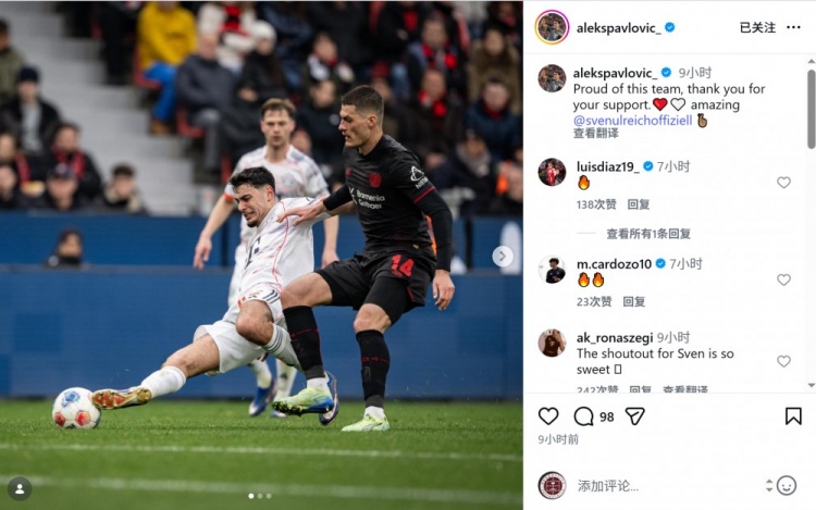 拜仁中場帕夫洛維奇社媒曬出比賽照片,配文:“為這支球隊感到驕傲,感謝你們的支持,烏爾賴希表現太棒了。”