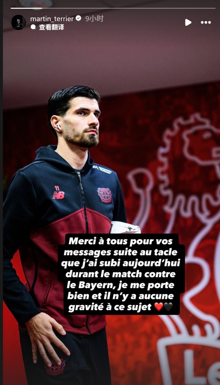 泰里耶社媒報(bào)平安,他寫道:“感謝大家在我今天對(duì)陣拜仁的比賽中被鏟球后發(fā)來(lái)的關(guān)心問(wèn)候,我目前感覺(jué)良好,傷勢(shì)沒(méi)有大礙?!?/p>