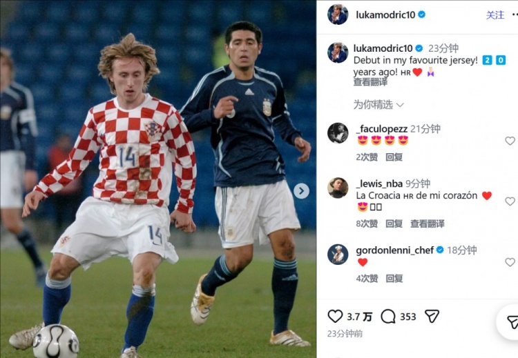 莫德里奇寫(xiě)道:“身披我最?lèi)?ài)的球衣首秀!就在20年前!”