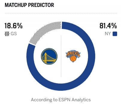 ESPN今日給出本場(chǎng)比賽的勝率預(yù)測(cè),勇士只有18.6%,尼克斯81.4%占?jí)旱剐詢?yōu)勢(shì)。