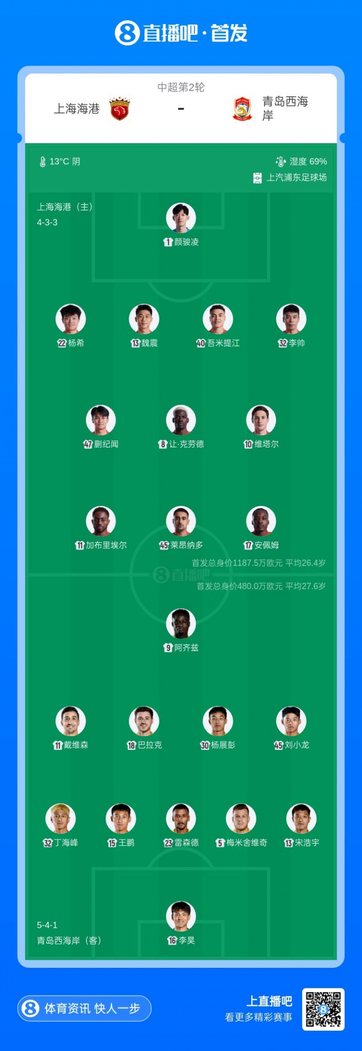 直播吧03月15日訊 中超第2輪,上海海港vs青島西海岸的比賽將在19點(diǎn)開球,賽前首發(fā)陣容出爐。