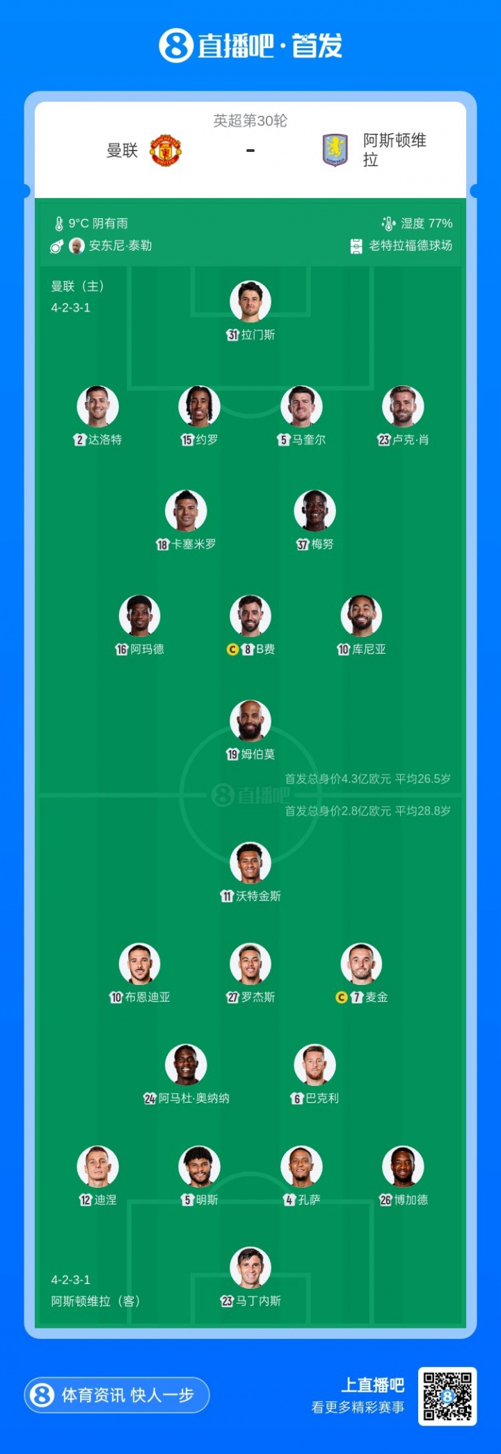 目前兩支球隊29輪均積51分,本場比賽是英超第三名之爭的直接對話!賽季首回合交手維拉2-1取勝,回到老特拉福德曼聯(lián)渴望復(fù)仇。