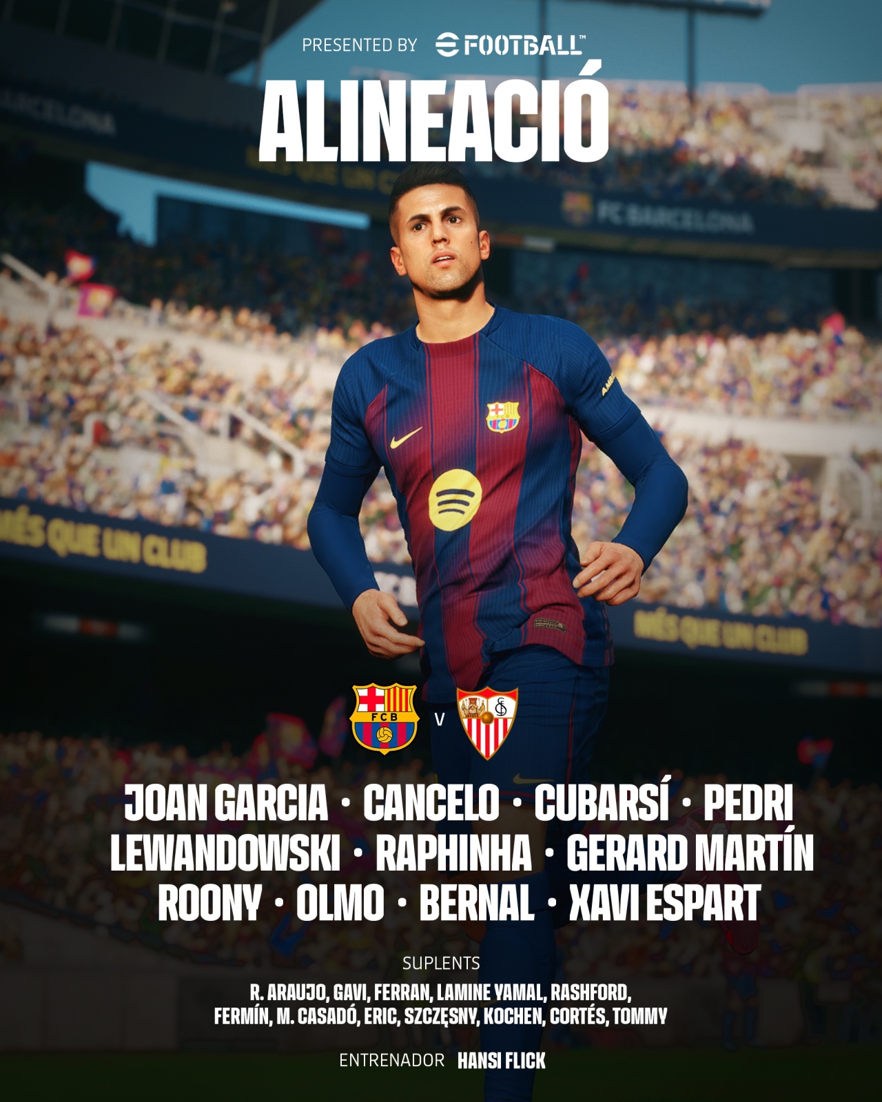 巴薩替補:25-什琴斯尼、31-迭戈·科肯、4-阿勞霍、24-埃里克·加西亞、6-加維、16-費爾明、17-卡薩多、43-托米·馬奎斯、7-費蘭、10-亞馬爾、14-拉什福德、36-科爾特斯
