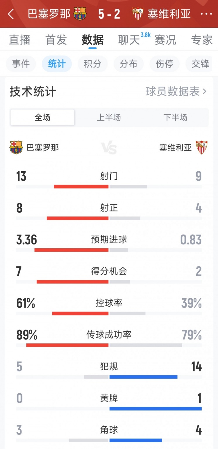直播吧3月16日訊 在本輪西甲,巴薩5-2擊敗塞維利亞,以下為雙方全場數(shù)據(jù)對比: