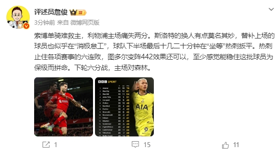 直播吧03月16日訊 本輪英超,利物浦1-1戰(zhàn)平熱刺。賽后,評(píng)述員詹俊發(fā)文點(diǎn)評(píng)。