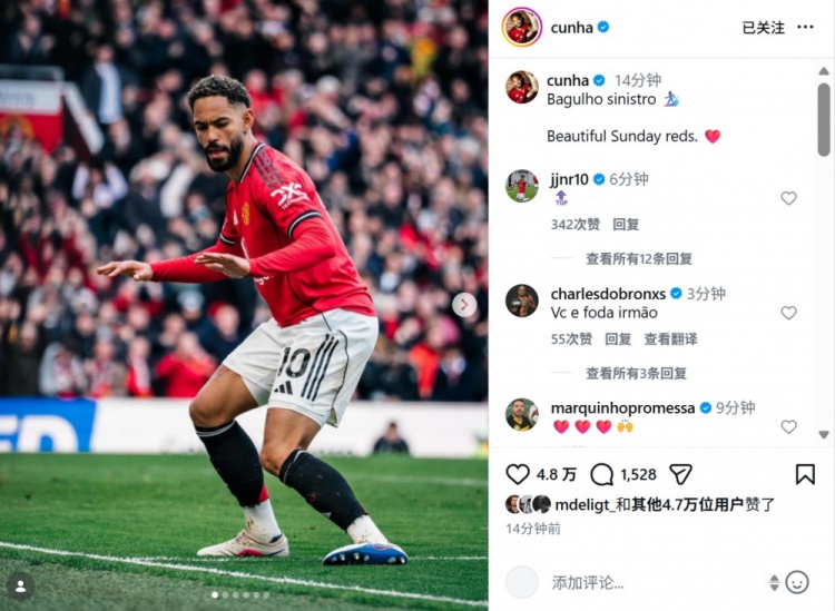 本場(chǎng)比賽庫(kù)尼亞打進(jìn)精彩進(jìn)球,賽后他也在個(gè)人社媒曬出本場(chǎng)進(jìn)球后沖浪慶祝動(dòng)作照片,配文寫道:“美好的周日,紅魔球迷們!”