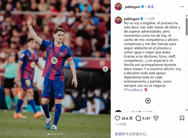 在社交媒體上,加維寫道:經(jīng)歷了數(shù)月的痛苦與挑戰(zhàn),我終于迎來了今天的復(fù)出時刻。隊友們和球迷們的關(guān)愛讓我深受感動,也給了我繼續(xù)前進(jìn)的力量。感謝醫(yī)生、理療師、工作人員以及我的隊友們,特別要感謝我的家人在這段時間里的陪伴。對于球迷朋友們的支持,我會用每一次訓(xùn)練和比賽中的全力以赴來回報你們,這是毋庸置疑的。加油巴薩!
