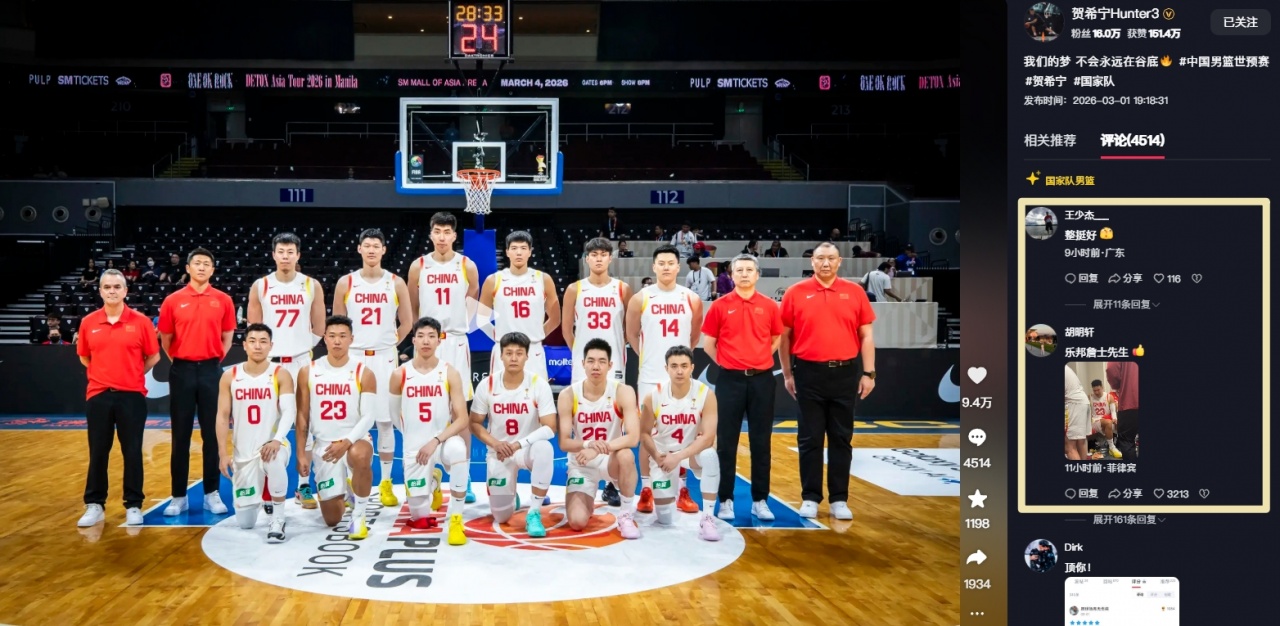 中國(guó)男籃球員賀希寧首發(fā)出場(chǎng)19分54秒,9投4中,其中三分5中2,拿到10分1籃板1助攻1搶斷。