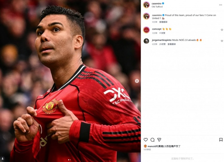 本場比賽卡塞米羅先拔頭籌,賽后他也在個人社媒曬出自己手指曼聯(lián)隊徽的慶祝動作,配文寫道:“為我們的球隊感到驕傲,為我的球迷驕傲!加油紅魔!”
