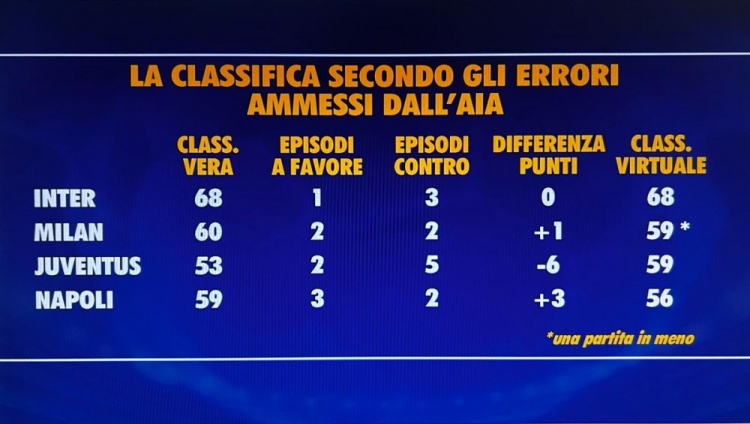 意甲無誤判情況下積分榜前四名: