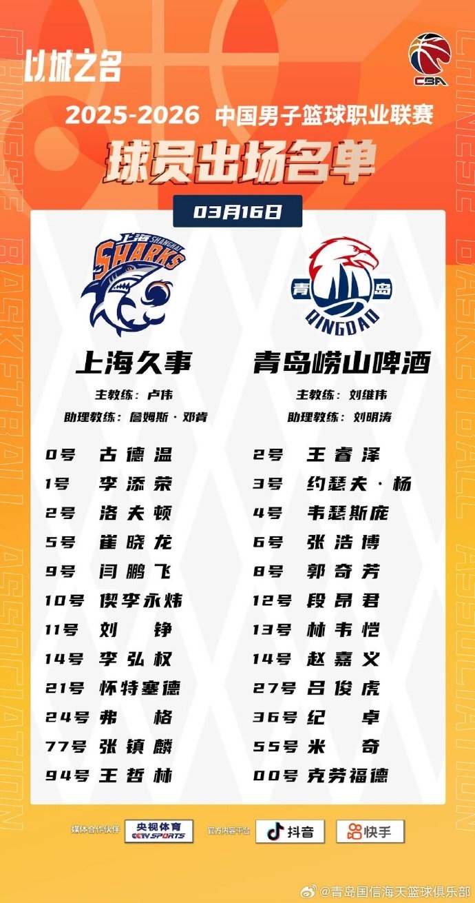 直播吧3月16日訊 今晚19:35CBA常規(guī)賽,上海主場迎戰(zhàn)青島,賽前雙方公布了本場大名單。
