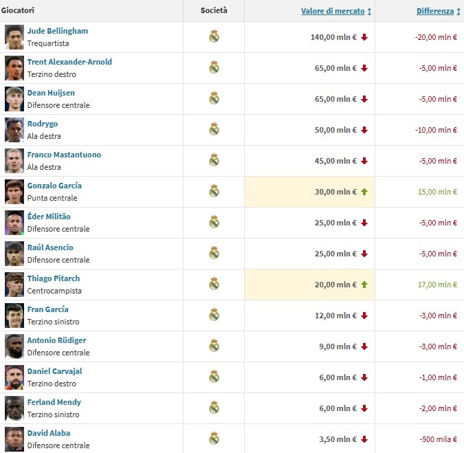 皇馬球員身價(jià)變化: