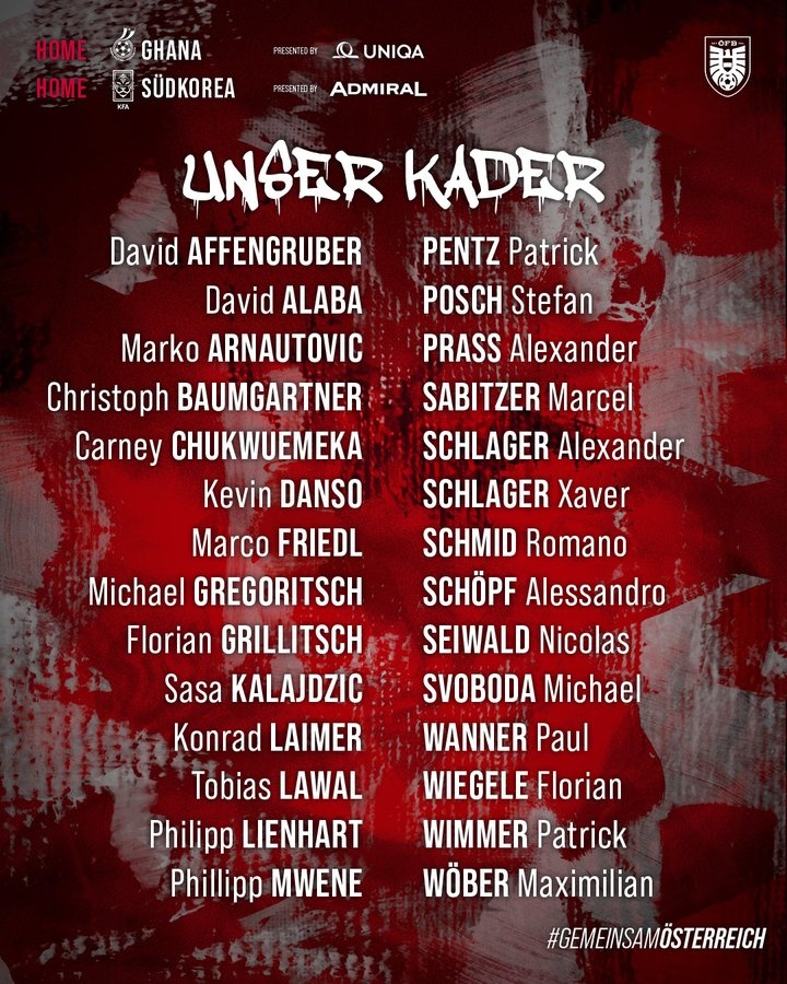 本月國際比賽日,奧地利將與加納以及韓國交手。