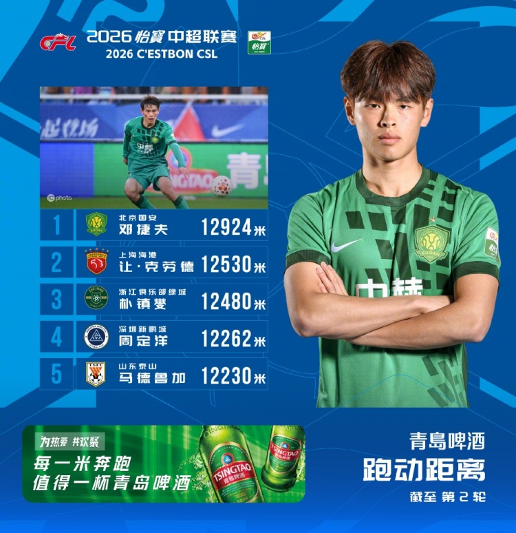 直播吧3月16日訊 今日,中超聯(lián)賽官方公布了第2輪聯(lián)賽跑動(dòng)榜,18歲國(guó)安小將鄧捷夫以12924米的跑動(dòng)距離登頂跑動(dòng)榜。