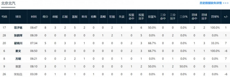 北京:范子銘8分5籃板2助攻,翟曉川5分3籃板1助攻。