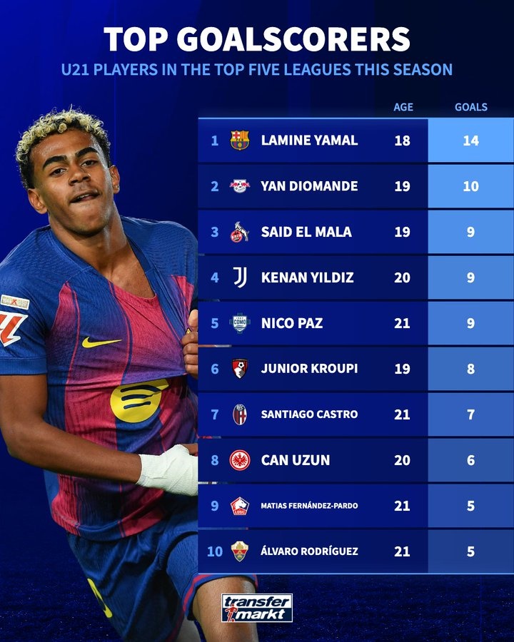 直播吧3月16日訊 德轉(zhuǎn)列五大聯(lián)賽U21球員本賽季聯(lián)賽進(jìn)球榜,亞馬爾14球居首,揚(yáng)·迪奧曼德10球第二。