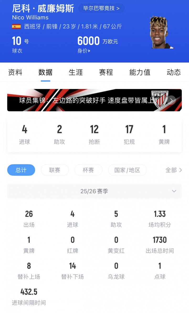 尼科·威廉姆斯現(xiàn)年23歲,他本賽季出場26次,僅貢獻4球5助。