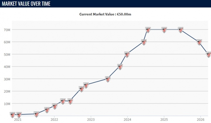 直播吧03月16日訊 德轉(zhuǎn)今日更新西甲身價,畢巴邊鋒尼科·威廉姆斯身價再次下跌1000萬歐,現(xiàn)身價剩5000萬歐。