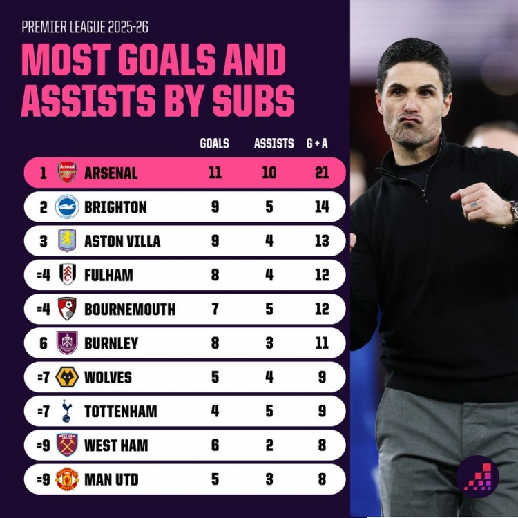 直播吧3月17日訊 Opta統計了2025/26賽季英超聯賽中,各隊替補球員貢獻的進球和助攻數據,阿森納位列第一。