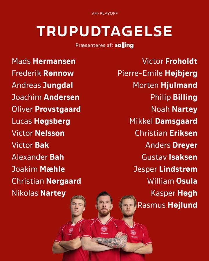 后衛(wèi):安諾森(富勒姆)、普羅夫斯加德(拉齊奧)、霍斯貝里(斯特拉斯堡)、維克托·尼爾森(維羅納)、維克托·巴克(中日德蘭)、亞歷山大·巴(本菲卡)、梅勒(沃爾夫斯堡)