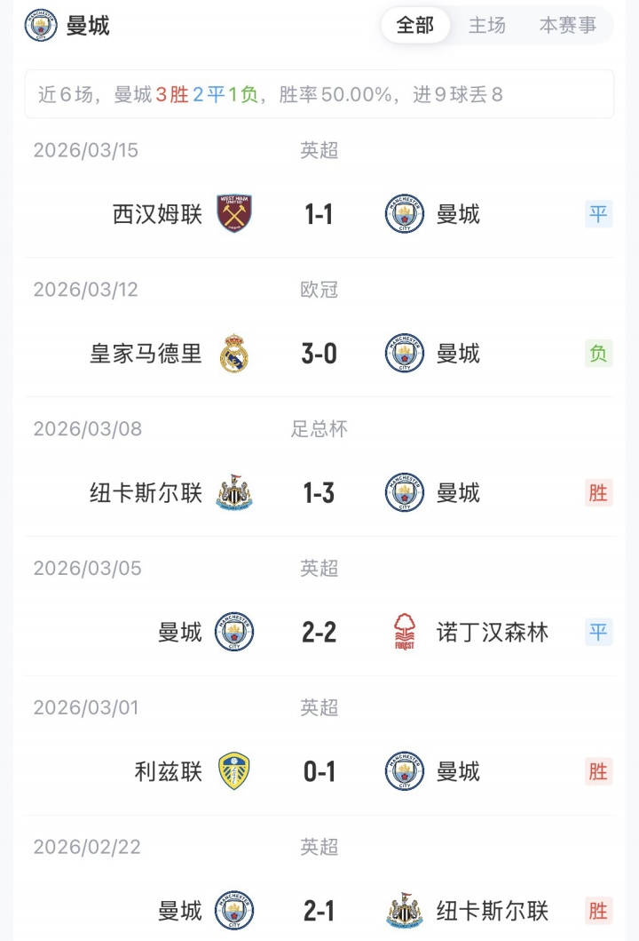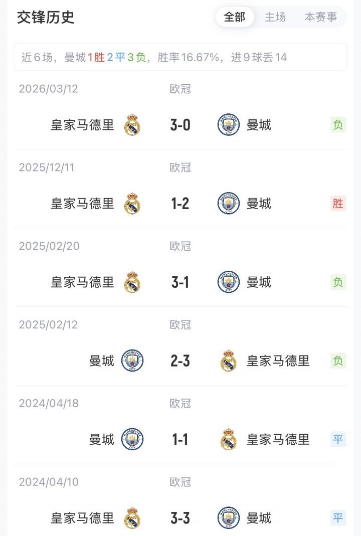 曼城首回合0-3不敵皇馬,兩隊(duì)歐冠已交手16次,曼城5勝4平7負(fù)。此前的6次淘汰賽對(duì)決,皇馬4次晉級(jí),曼城2次晉級(jí)。