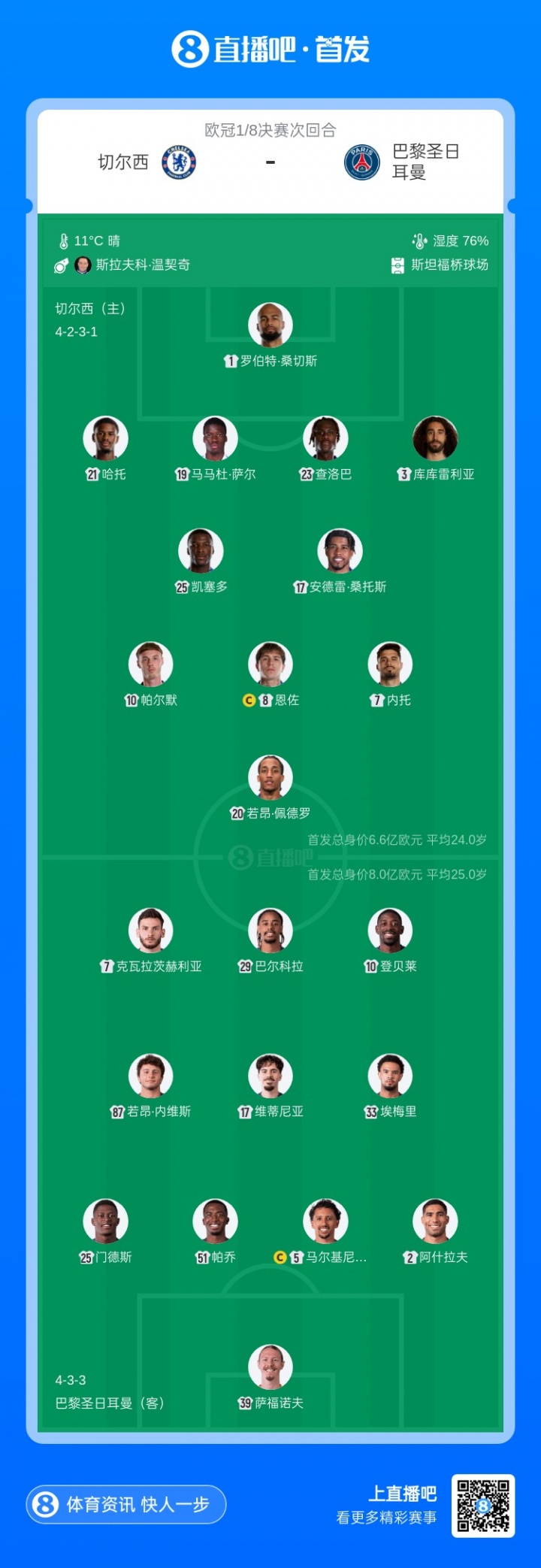 切爾西vs巴黎首發(fā):詹姆斯傷缺!桑切斯帕爾默先發(fā) 登貝萊K77登場