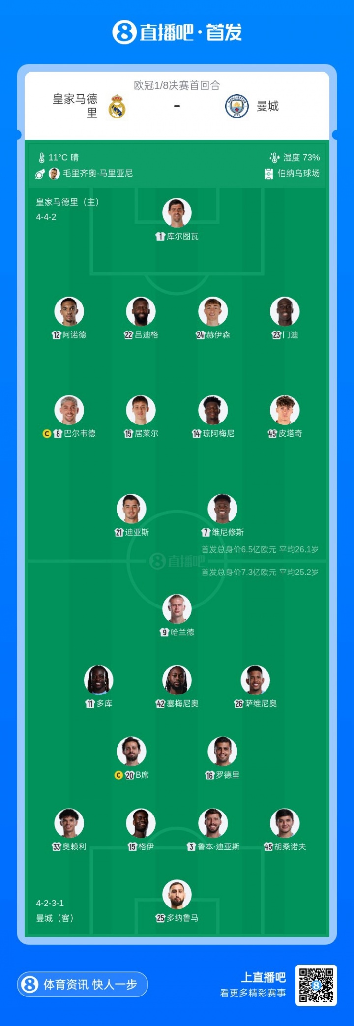 直播吧03月18日訊 歐冠1/8決賽次回合,曼城對陣皇馬,兩隊(duì)首發(fā)公布。