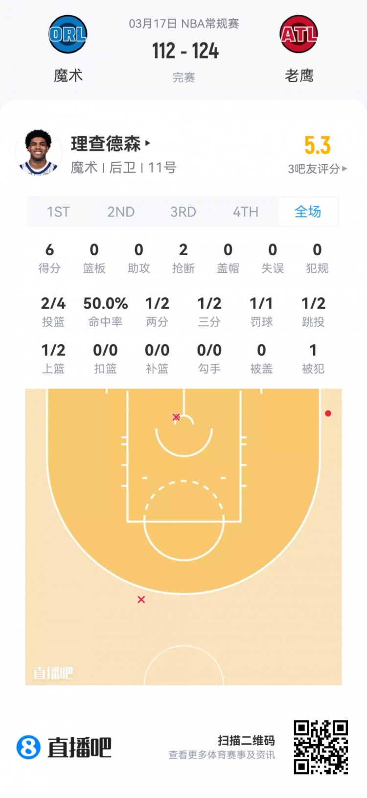 魔術(shù)首輪25號(hào)秀小理查德森 登場(chǎng)5.5分鐘