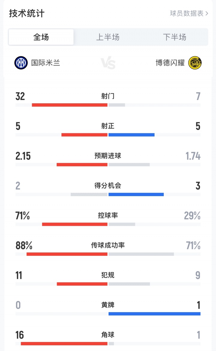 國米vs博德閃耀次回合全場數(shù)據(jù):