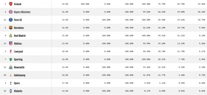 直播吧03月18日訊 今天凌晨歐冠產(chǎn)生了4支晉級8強(qiáng)的球隊,明天另外4支8強(qiáng)球隊也將誕生。OPTA更新了他們對歐冠奪冠概率的預(yù)測,阿森納仍然斷檔第一。