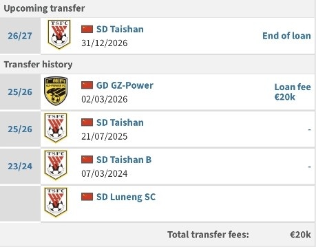 德轉(zhuǎn)王昊斌個(gè)人頁面顯示,他于2月3日以2萬歐元的租借費(fèi),從山東泰山租借加盟廣州豹。租借合同為期一個(gè)賽季。