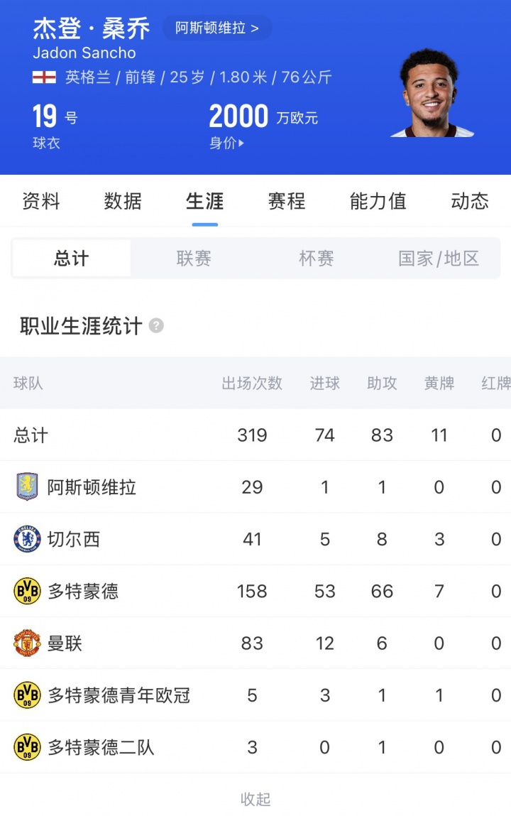 桑喬在19/20賽季打出自己生涯至今的最佳表現(xiàn),他為多特出場44次,貢獻20球20助,彼時19歲的他身價達到1.3億歐的最高點,如今6年過去,年僅25歲的桑喬身價跌剩2000萬歐。